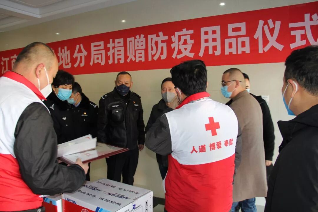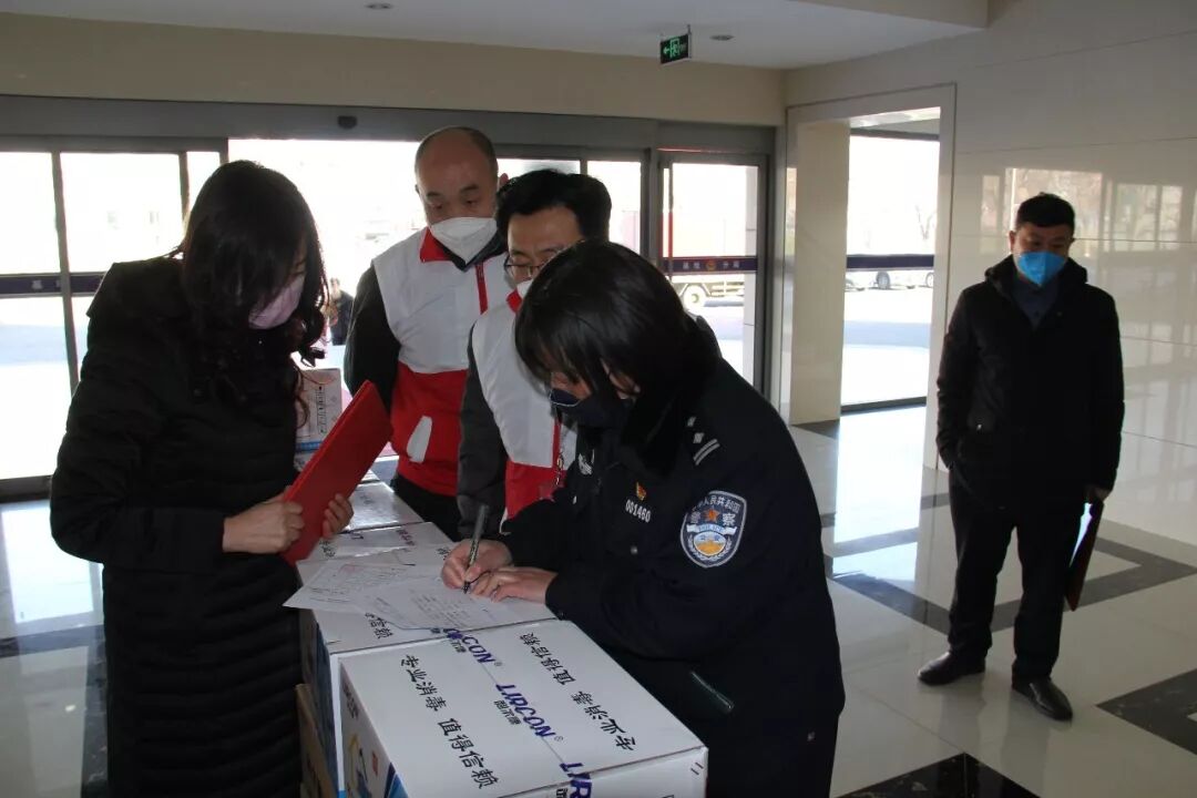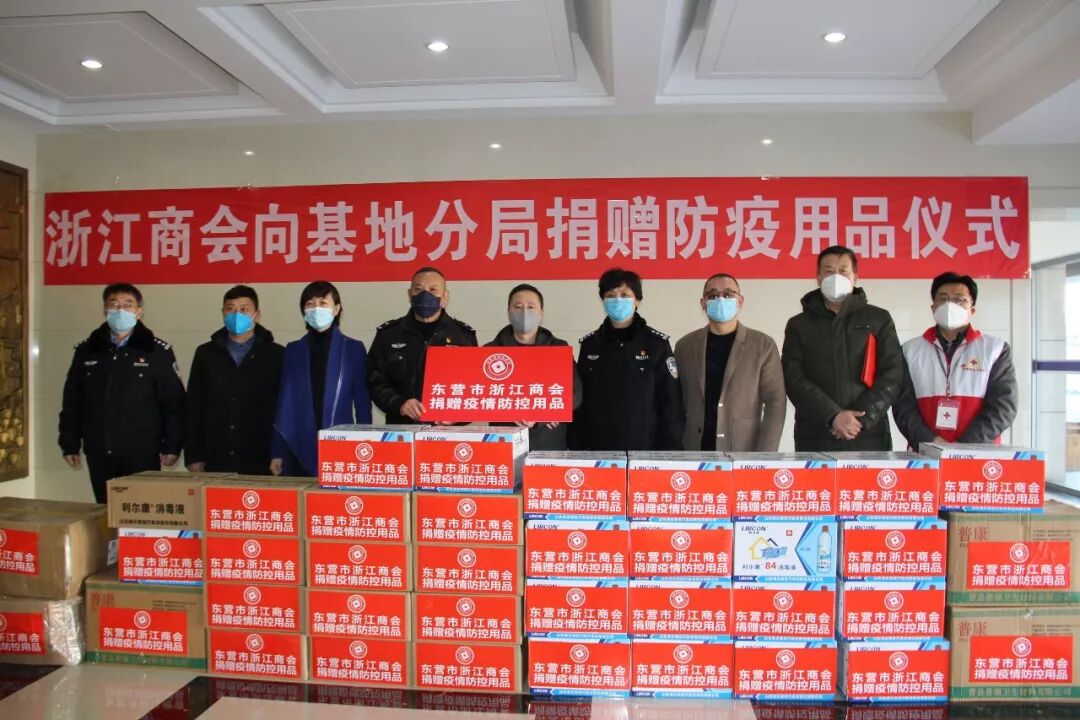 2月17日,东营市浙江商会会长高博、常务副会长任永阳、党支部书记隋顺兴、副会长李德众在东营区工商联主席李玉琴的陪同下,来到滨海公安局基地分局捐赠疫情防护用品。