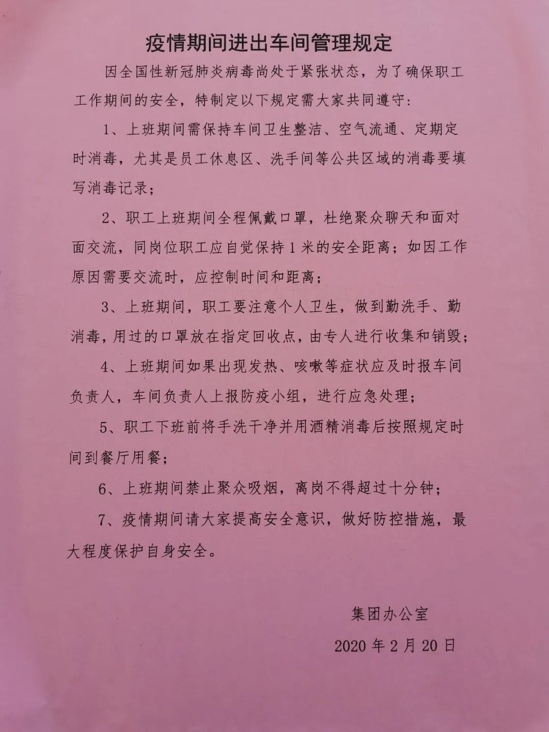 面对疫情不惧怕、不恐慌,在科学的宣传与指导下,积极、合理面对。第一时间编撰《疫情防控返岗须知》《食堂就餐管理规定》《车间进出管理规定》《新型冠状病毒肺炎知识宣传栏》,通过设立宣传看板及微信、钉钉等方式普及给每一位员工,并择优在公司微信公众号推送疫情预防知识,做到科学预防,不信谣、不传谣。