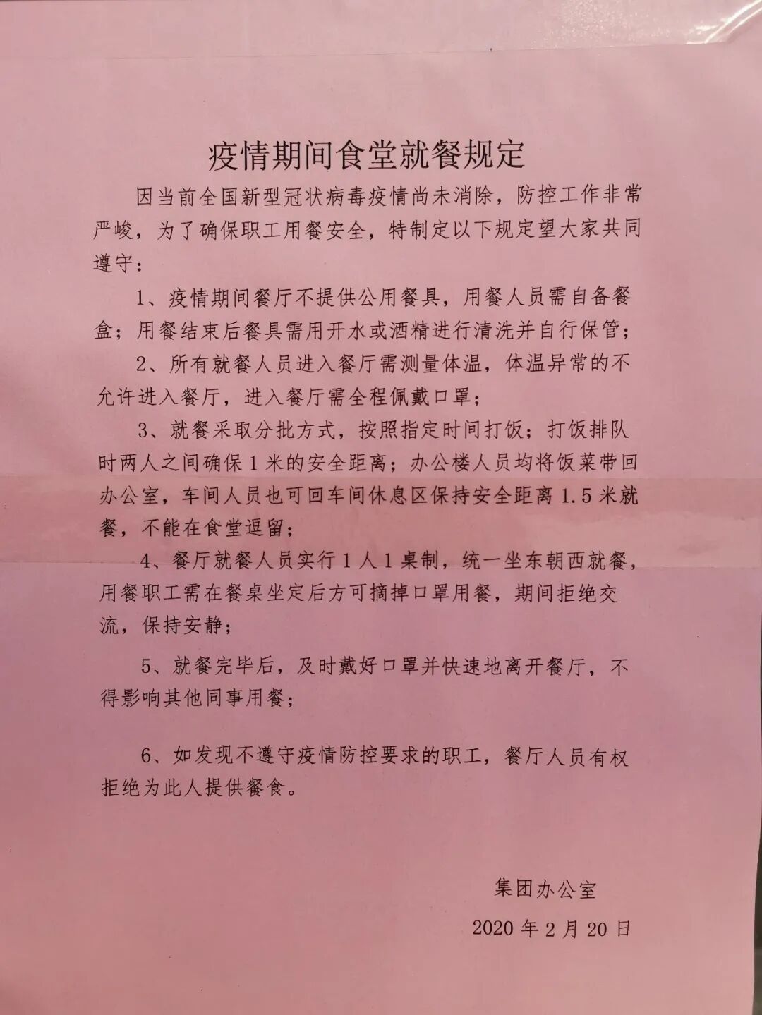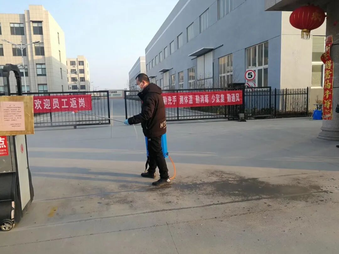 防疫物资全部到位,厂区、办公楼全天候无死角进行消毒,就餐鼓励员工自带餐具、错时就餐。